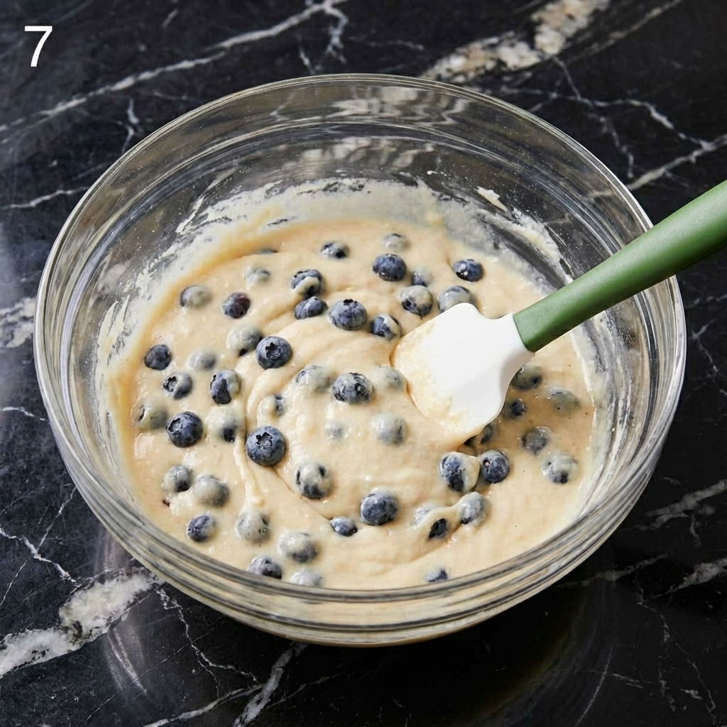Using a spatula, gently fold the floured blueberries into the batter. Fold just a few times until evenly distributed. Be gentle to avoid crushing the berries .
