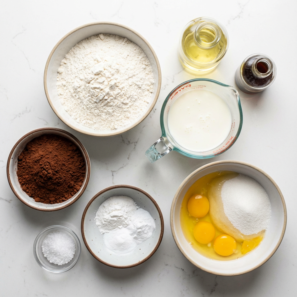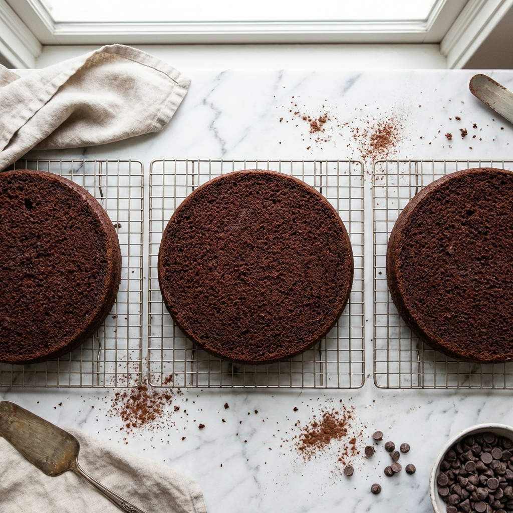 Preheat oven to 350°F (175°C). Grease and flour three 8-inch round cake pans and line the bottoms with parchment. Sift flour, cocoa, baking soda, baking powder, and salt. In a separate bowl, whisk buttermilk, water, and oil. In a large bowl, beat sugar and eggs until light and fluffy. Beat in vanilla.