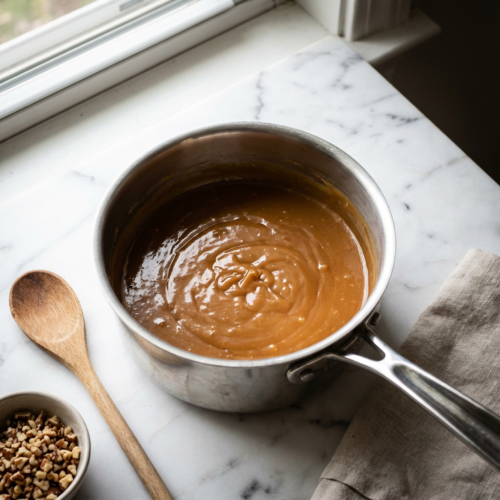 Remove the cooked frosting base from heat. Stir in the toasted coconut and chopped pecans. Let the frosting cool, stirring occasionally, until it reaches a thick, spreadable consistency, about 1 hour.