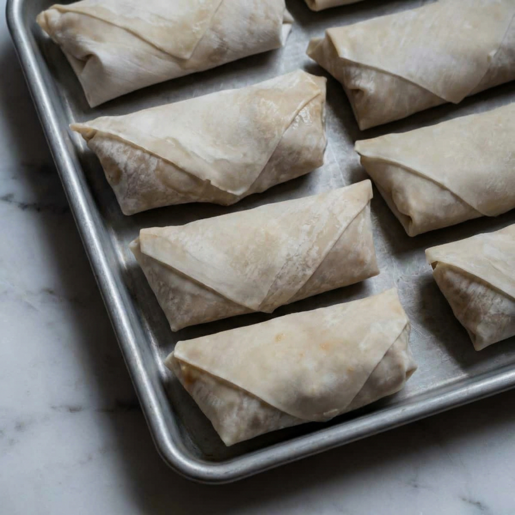Reheat in a 375°F (190°C) oven for 8–10 minutes to restore crispness. Avoid microwaving, as it softens the wrapper.
