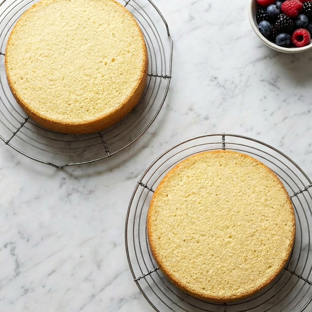Gently fold flour into egg mixture in three additions. Fold in warm milk and melted butter until just combined. Divide batter between pans, bake 20-25 minutes until golden and springy. Cool completely in pans, then level tops if needed.