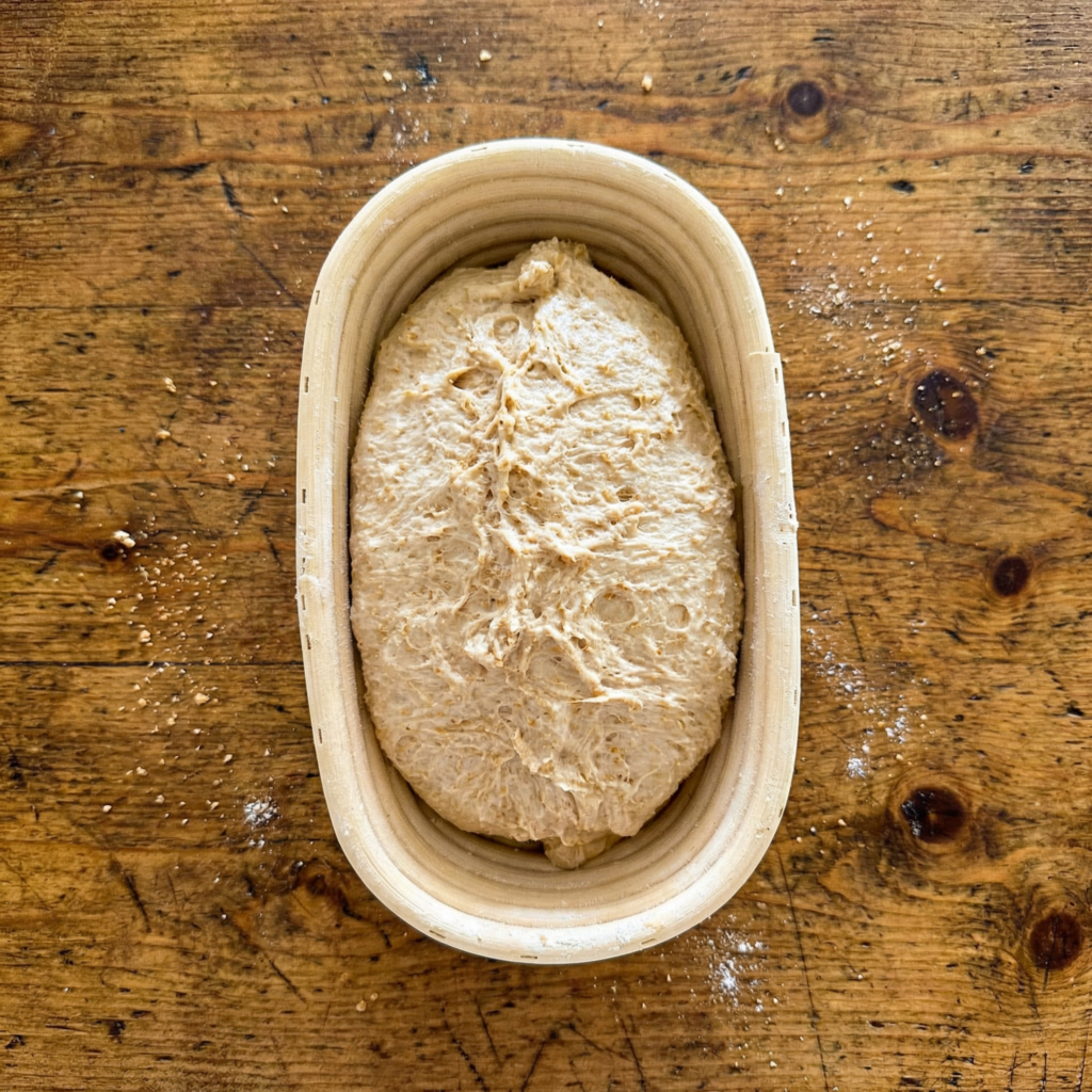 Let it rest uncovered for 20–30 minutes. This bench rest relaxes the gluten, making final shaping easier and improving structure.