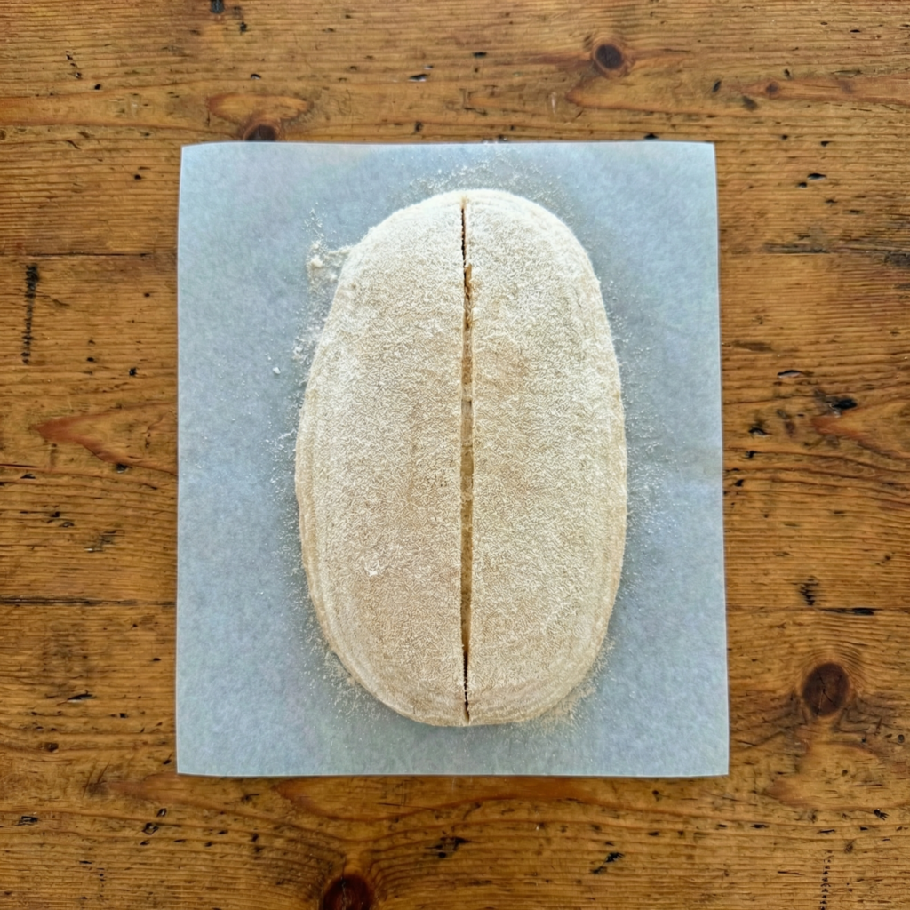 Turn the dough out onto parchment paper. Using a sharp blade or lame, score the top with one deep slash about ½ inch deep.