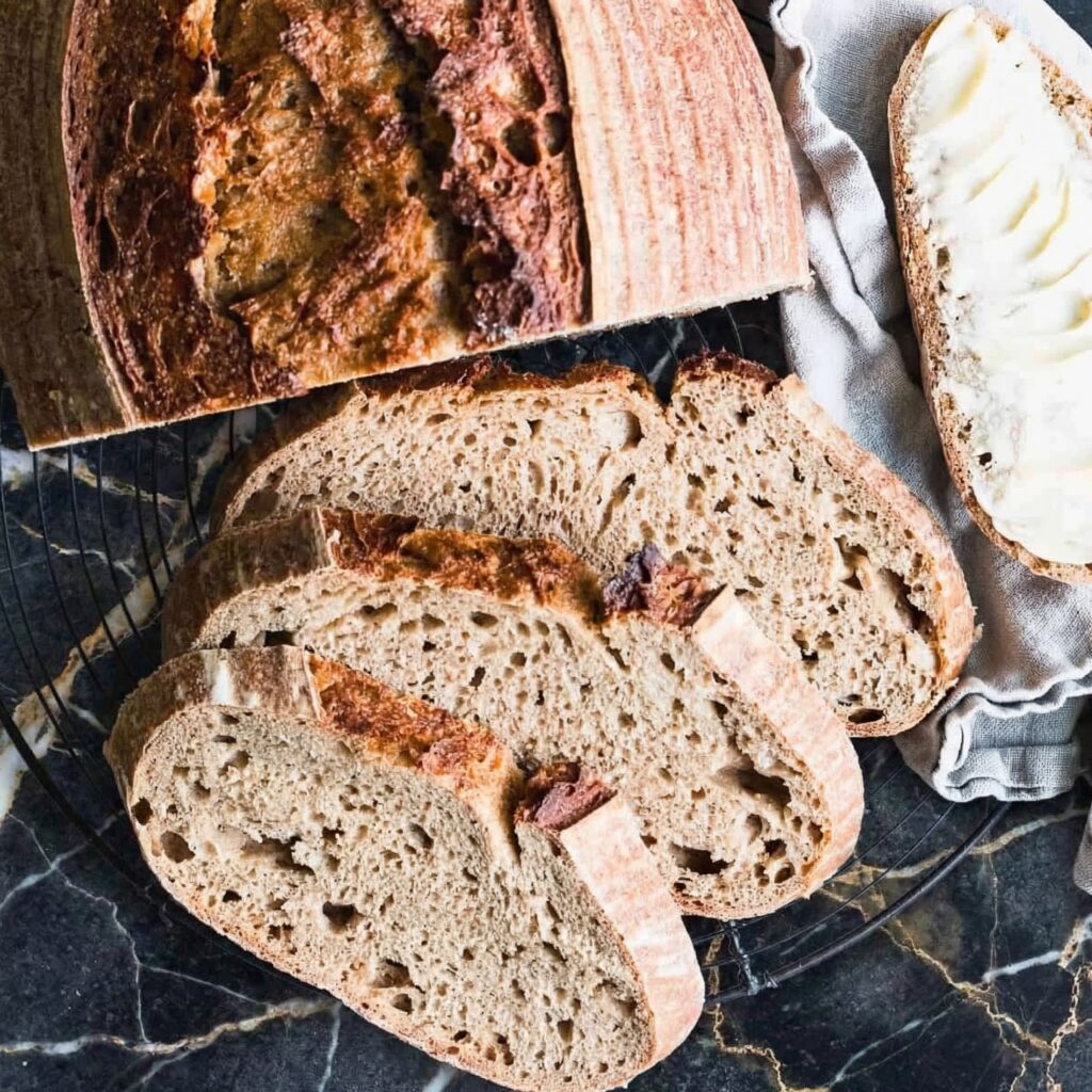 Once completely cool, slice with a serrated knife. Serve with butter, use for sandwiches, or toast.