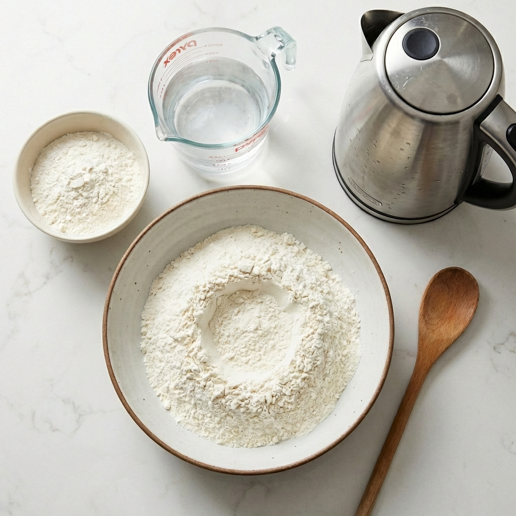In a large bowl, mix flour and salt. Make a well and carefully add the boiling water. Stir with chopsticks or a spatula until a shaggy dough forms. Gradually add the room-temperature water until all flour is incorporated.