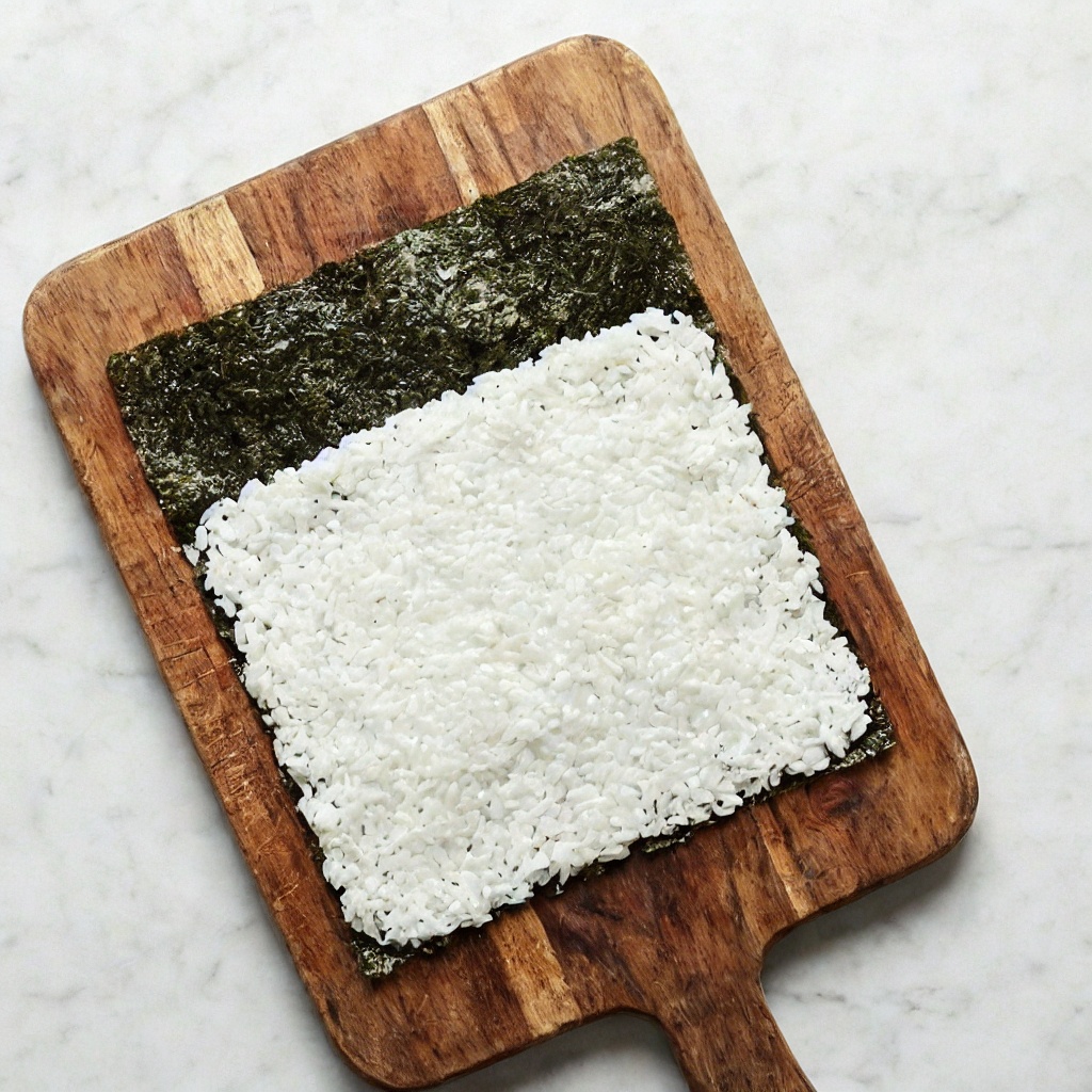 Dip your hands in the vinegar water to prevent sticking. Grab a handful of sushi rice (about ¾ cup) and gently spread it evenly over the nori, leaving a 1-inch strip bare at the top edge. Press the rice down gently but firmly—you want an even, compact layer about ¼-inch thick .