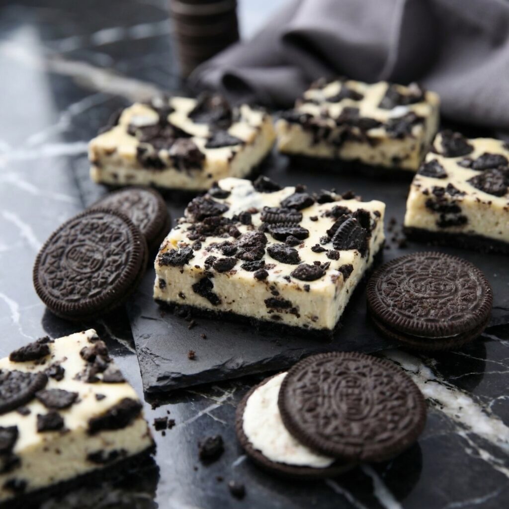 The crust is made from whole Oreos, the cheesecake filling is smooth and rich, and the Oreo pieces throughout add that signature cookies-and-cream crunch. Serve them chilled for the perfect texture.