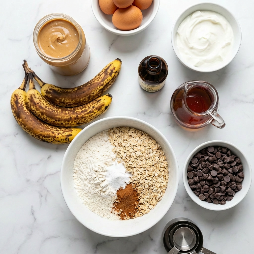 Preheat oven to 350°F (175°C). Line a 12-cup muffin tin with liners or grease well. In a large bowl, whisk together the mashed bananas, maple syrup, peanut butter, eggs, Greek yogurt, and vanilla extract until smooth and well combined.