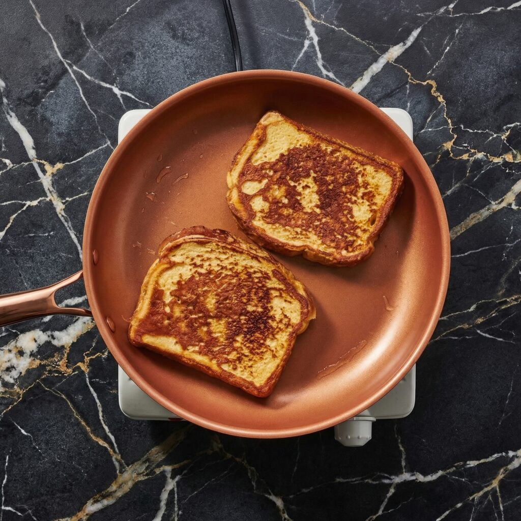 Cooking over medium heat allows the sugars and proteins in the custard-soaked bread to undergo the Maillard reaction—a complex chemical process that creates hundreds of new flavor compounds and that signature deep golden-brown, crisp crust. Too high heat burns the outside before the inside sets; too low leaves you with pale, soggy toast.