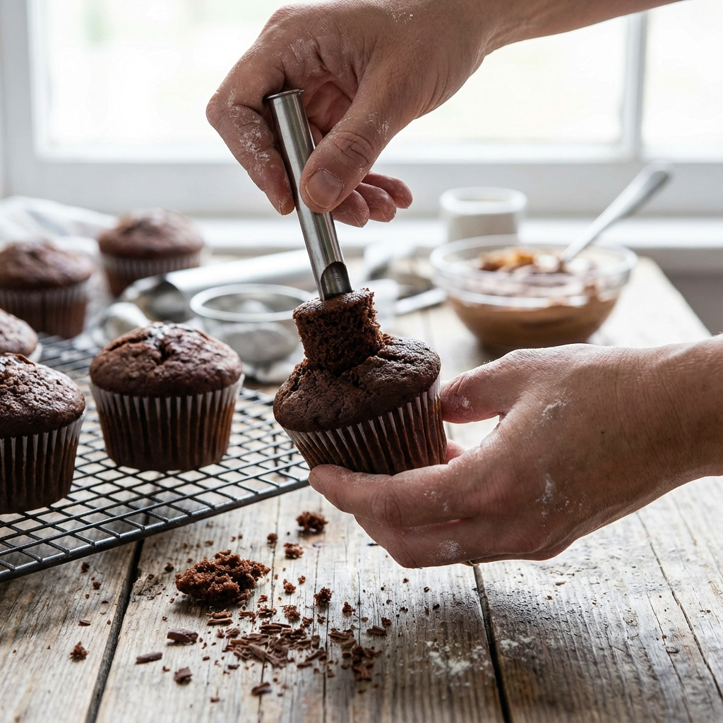 Use a cupcake corer, apple corer, or small knife to remove a cone-shaped piece from the center of each cooled cupcake. Discard or save scraps. Fill each cavity with about 1 teaspoon of the caramel-peanut mixture.