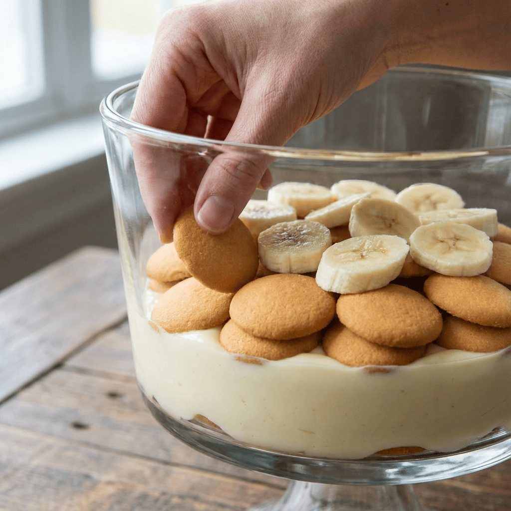 In a 9×13 dish or large trifle bowl, spread a thin layer of warm pudding. Add a layer of vanilla wafers, then a layer of banana slices. Spoon more pudding over the bananas. Repeat layers, ending with a final layer of pudding. Ensure the top layer of pudding covers all bananas to prevent browning.