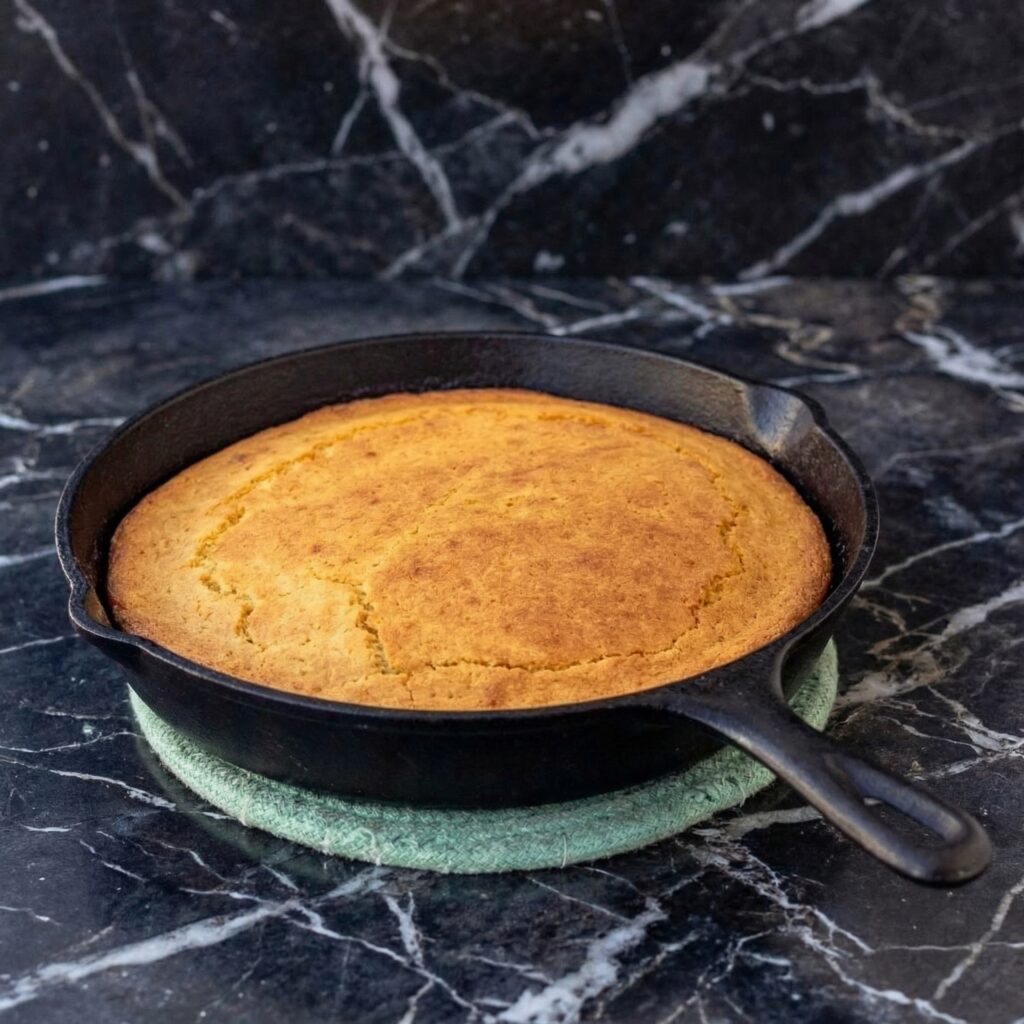 Let the cornbread cool in the skillet for 10-15 minutes before slicing. Serve warm with butter and honey.